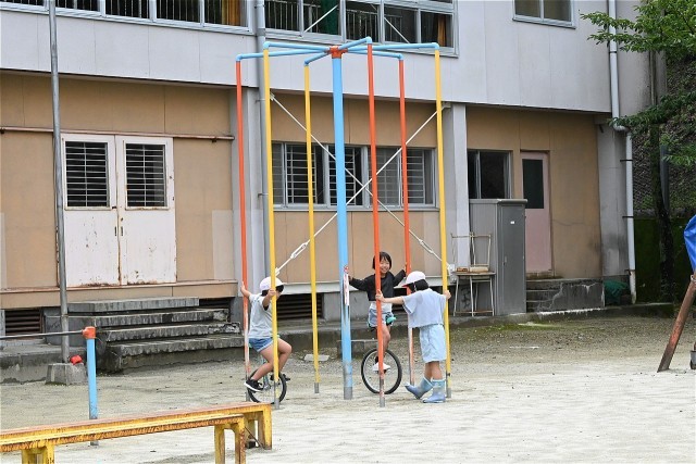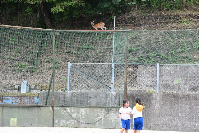 暑さがやわらいできたので、外遊びする子が増えてきています。サッカーや鬼ごっこ、一輪車などの他、800Mチャレンジ大会のために走っている子もいます。校庭が賑やかなせいか、シカの子も様子を見に来たようです。