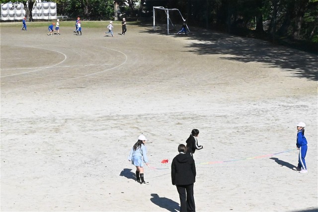 総練習が終わってほっとした子どもたち。休み時間はいつも通りたくさん外で遊んでいます。前庭では、遊具や鬼ごっこ、虫とりなどをして楽しんでいます。3年生以上の子も1年生と鬼ごっこをしていて楽しそうです。校庭では、サッカーや鉄棒、長縄などで元気いっぱい遊んでいます。校庭に6年生の姿が見えないと思ったら、縦割り班長会をやっていました。新しい班員にうまく動いてもらうように頑張っているようです。
