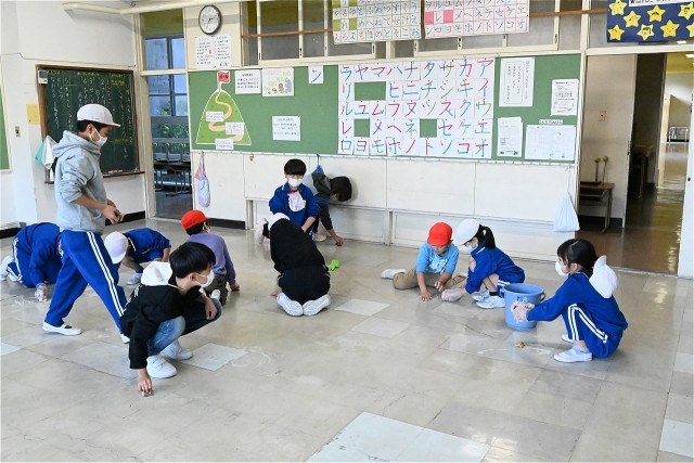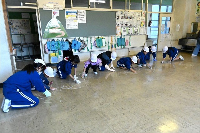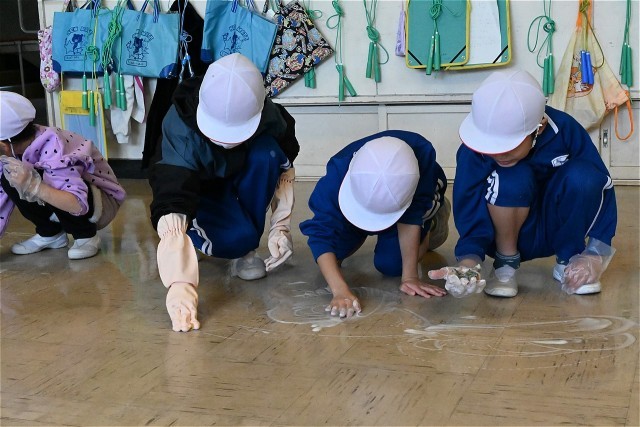 先週の金曜日はワックス清掃の日でした。5時間目に教室の机や椅子などを全部廊下に出し、床についた汚れを洗剤とスポンジで丁寧に落としました。床には絵の具や墨などがあちこちについているので、汚れを見つけては落とす作業を繰り返し、とてもきれいな床になりました。