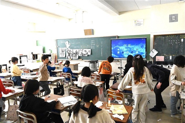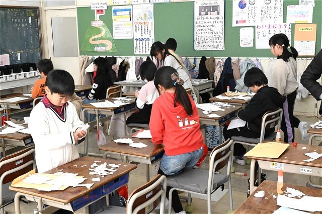 2年生は図工で紙版画づくりをやっていました。画用紙をちぎって、人の顔や体、手足などのパーツを作っているところでした。上手にできそうなので完成するのが楽しみです。