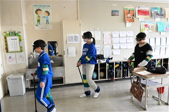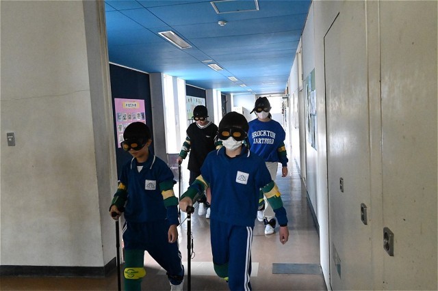 水曜日に5年生は高齢者疑似体験を行いました。福祉の里センターの方に指導をしていただきながら、視界を制限するゴーグルを付けたり、足取りを重くするための重りやサポーターを付けたりして、お年寄りに近い状態で体験をしました。衣服の脱着、トイレの使用、豆つかみなどをやりましたが、なかなか大変な様子でした。お年寄りの方の苦労が分かり、困っていたら手を貸してあげたいと思っている子がたくさんいました。