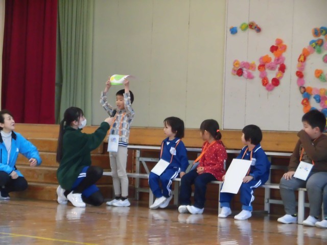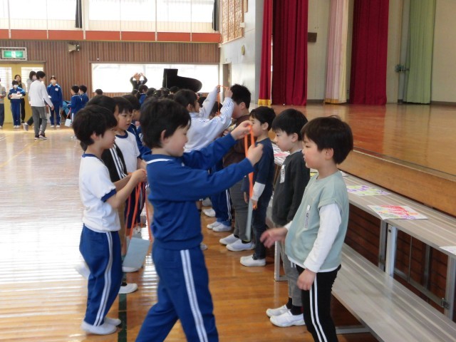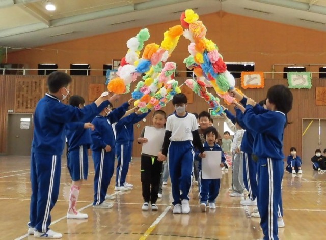 今日は、「1年生を迎える会」を行いました。1年生は6年生と手をつないで入場。会の最初には2年生から「あさがおの種」のプレゼントがありました。次は1年生の自己紹介。ひとり一人、名前と好きなものを元気いっぱいに紹介しました。この日のために準備した「好きなものの絵」もとても上手でした。最後は、全校○×クイズで大盛り上がりでした。この日のために、2年生はプレゼント、3年生は招待状、4年生は会場装飾、5・6年生は入退場の花のアーチや会場準備を行いました。2~6年生の優しさがつまった「1年生を迎える会」、1年生の笑顔が弾けていました。