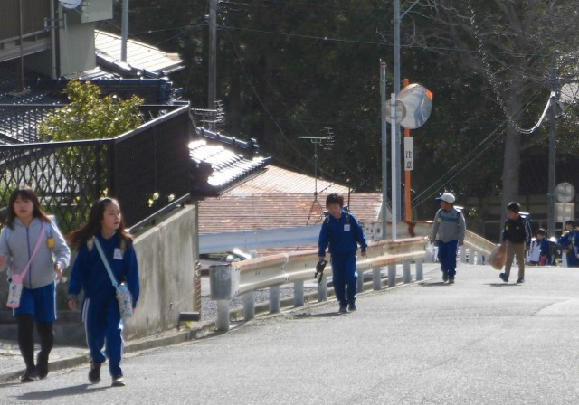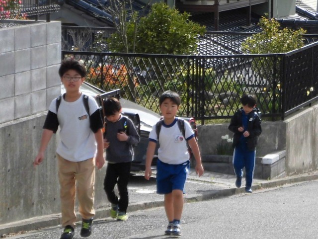 まぶしく輝く太陽の光を背に、子どもたちが登校して来ました。