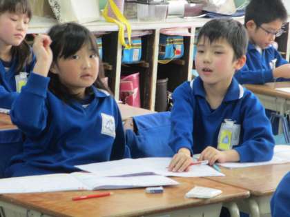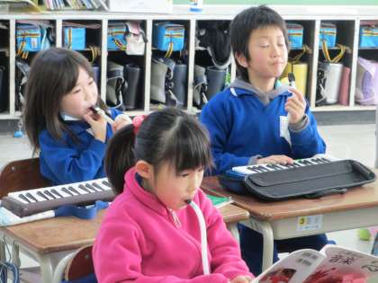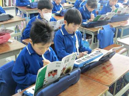 音楽では、先日紹介した時間の続きで、「こぎつね」の演奏をしました。前回、隣の席の女の子に手をとって教えてもらっていた子も、特訓(?)のかいもあって、一人で立派に演奏していました。まだ指遣いの怪しい子もいますが、確実に上達しています。立派な演奏でした。