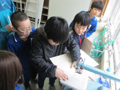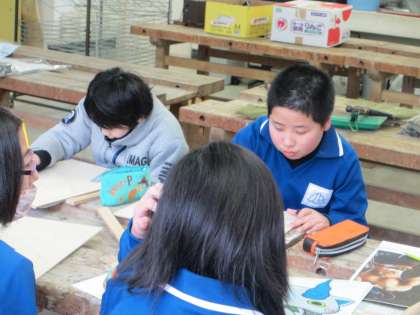 伝言板のデザインを描き終えた子がたくさん出てきたので、糸のこぎりで板を切る作業に移る子が出てきました。大部分の子は「糸のこ初体験」の子どもたちだったので、「緊張する〜。」とか「先生、怖くないんですか。」などと言いながら、作業の様子を見守っていました。怪我をしないということは勿論のことですが、順番を守ること、刃を折らないようにすることなど、留意点をよく守って、自慢の作品に仕上がることを期待します。(大和田)