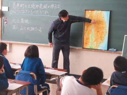 葛巻町の土地の様子や気候について学習しました。地図をもとにして、山に囲まれた土地であることを読み取ったり、気候について考えていったりしました。子どもたちは、大船渡と比較しながら、「北に位置しているのだから大船渡より寒い」とか「山に囲まれているのだから寒い」などと、しっかりと考えていました。みんなで調べてまとめたことをただ書いていくのではなく、できるだけ「予想→確かめ」の流れを大切にしていきたいと考えています。(大和田)