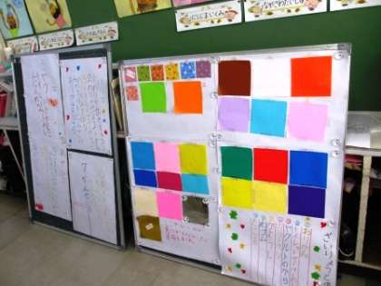 今日は、その準備のために、おもちゃの作り方や遊び方の説明をグループで練習しました。おもちゃの材料や詳しい作り方などを大きな紙に掲示し、分かりやすく解説しようという工夫がいたるところで見られました。