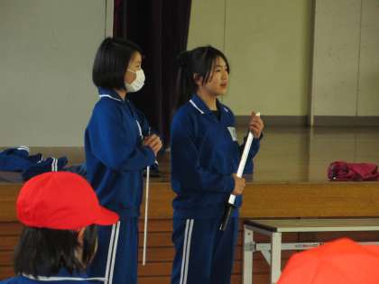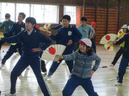 「扇子のときの腕はもっと上げてください。」「刀のときの腰はもっと落として。」などとふだん自分たちが芸能保存会の方々に教えていただいていることをきちんと伝えていきます。また、6年生の子どもたちも進んで隣で踊っている4年生に教えようとがんばっています。大変微笑ましかったです。