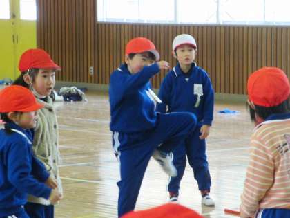 なわとびチャレンジとして、30秒間前回し跳びを跳んだ後、ドッジボールを行いました。前回は「転がしドッジボール」だったのですが、今回は「外野の子は当てることができたら内野に戻ることができる」「当てられても泣かないでがまんする」という2つのルールを加えて、普通のドッジボールにチャレンジしました。