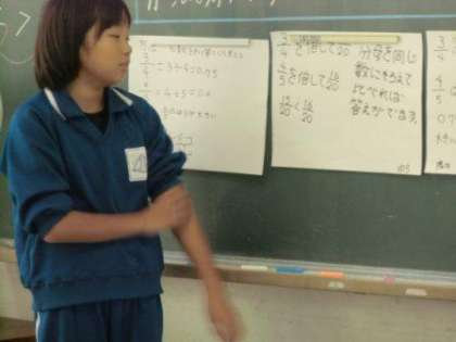 5年生の算数は、分母が違う分数の大きな比べです。自分の考えを紙に書いてみんなの前で発表していました。小数にして考えたり分数を倍にしていきながら分母が同じところで比べる考えを発表していました。この学習から、通分が出てくるのでしっかり理解して欲しいですね。(校長)