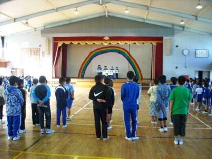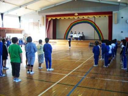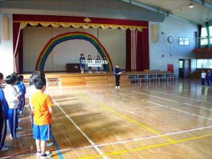 児童朝会で児童会から「学習発表会スローガン」の発表がありました。スローガンの意味や内容について説明があり、児童会の声にあわせて、全校で読み上げました。これに向けさらに練習がんばります。(木村)