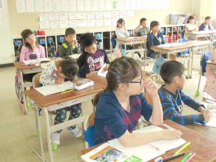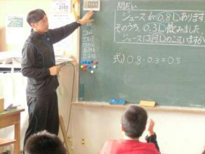3年生の算数は、小数のひき算の問題です。今日は、0,8−0,3の問題について考えていました。子ども達に計算をしてみてください。というとどの子もすぐに答えを求めることができました。答えが出来たので終わりでなく、その計算の仕方について言葉で言える学習にしていました。計算はあるパターンで解くことが出来ますが、言葉でとなると言えない子がほとんどです。本当に分かった事になるには、言葉でも説明できるようになることです。ぜひ身に付けてほしいですね。(校長)