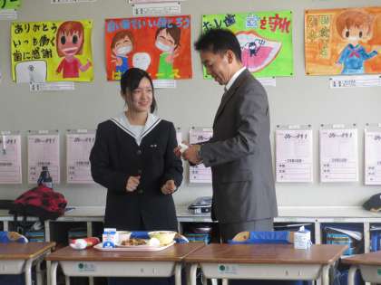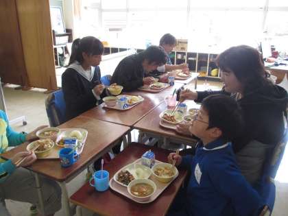 ●こぎつねごはん●牛乳●さんまのすり身汁●仲良しカルタン●なし『今日は、5,6年生と椿学級で一緒に給食を食べました。木下先生の教え子の実習生さんもいらっしゃり、会話もはずみ、楽しそうに給食を食べていました。あっという間でしたが、きっとたくさんの事を吸収できた3日間だったと思います。これからも将来の夢に向かって頑張っていくださいね。』(磯谷)