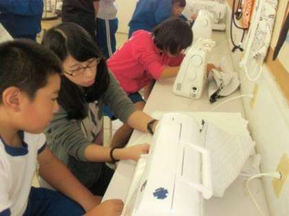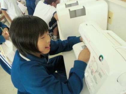 5,6年生の家庭科の時間です。今はナップザックやエプロンの制作のためにミシンを使って作業をしています。5年生は、あと2,3時間で完成するのでは? 子ども達は真剣な表情で作業をしていますよ。(校長)