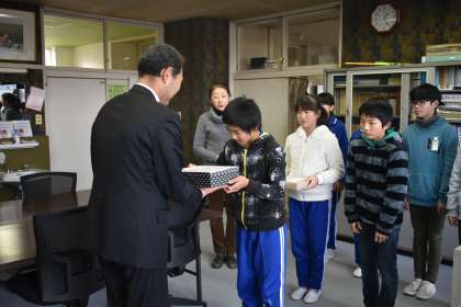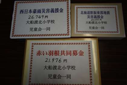 市社会福祉協議会へ全校児童で行った募金をお渡ししました。今回は,西日本豪雨災害,北海道胆振東部地震災害,赤い羽根共同募金への募金となりました。多くのお金が義援金として使われ,健康な生活のために使われます。保護者の方々のご協力に感謝しております。ありがとうございました。