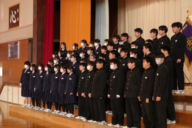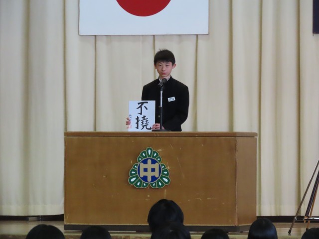 校長先生の式辞の後、2年生一人一人が立志の言葉を示した色紙を見せながら